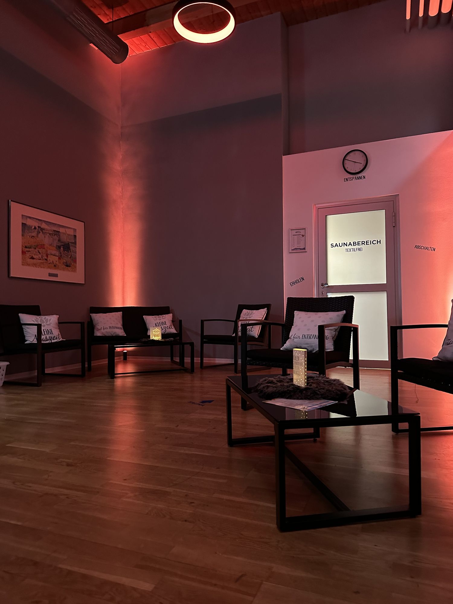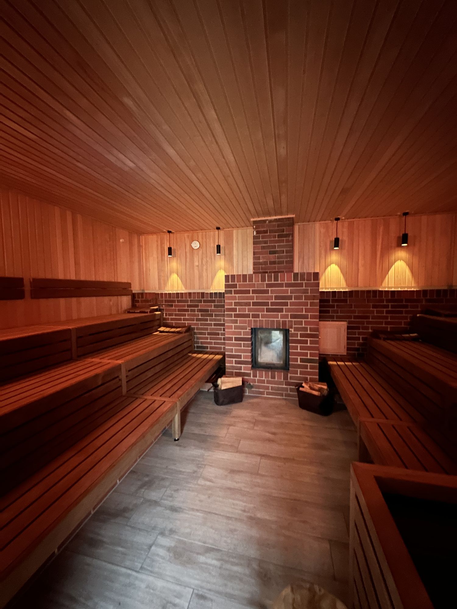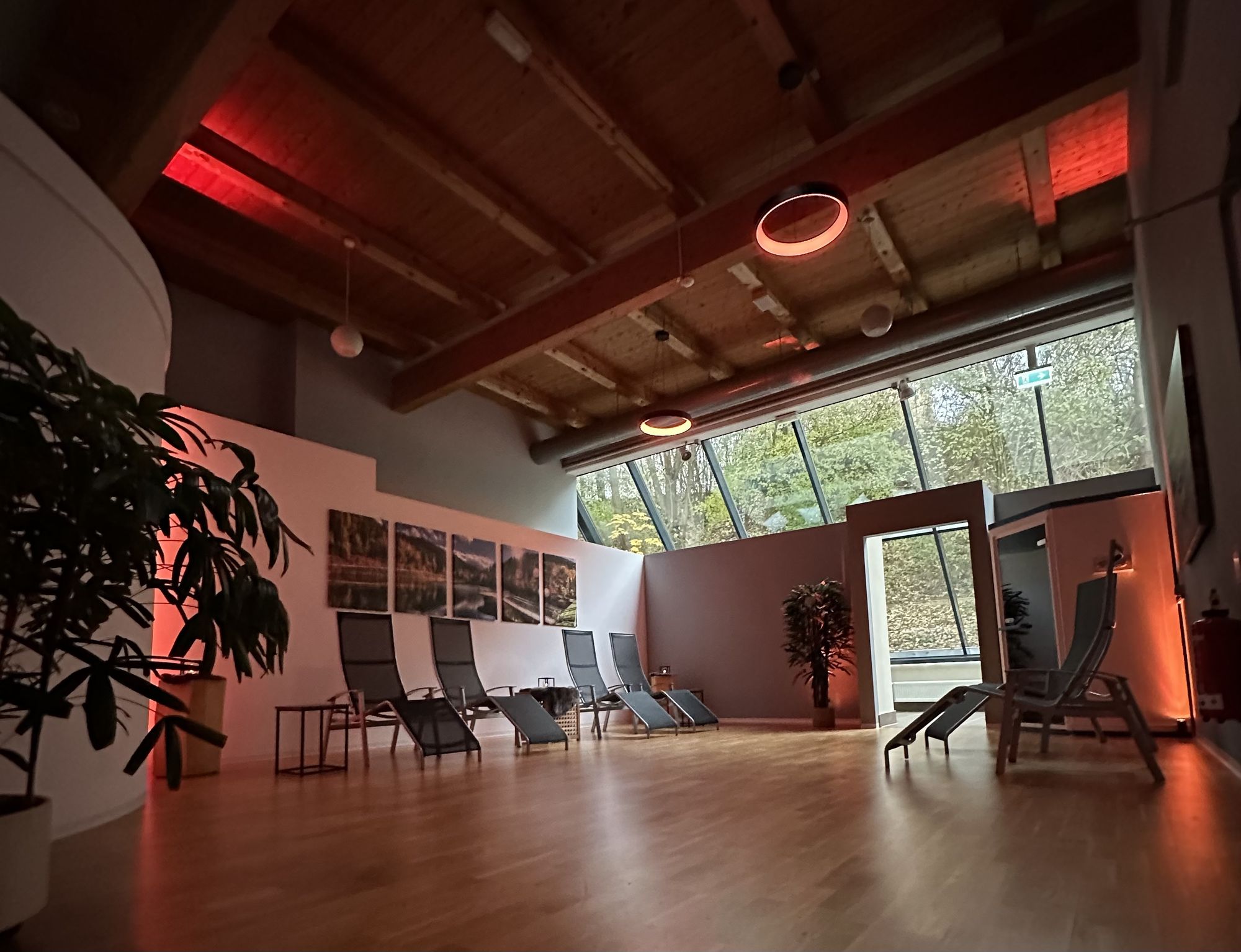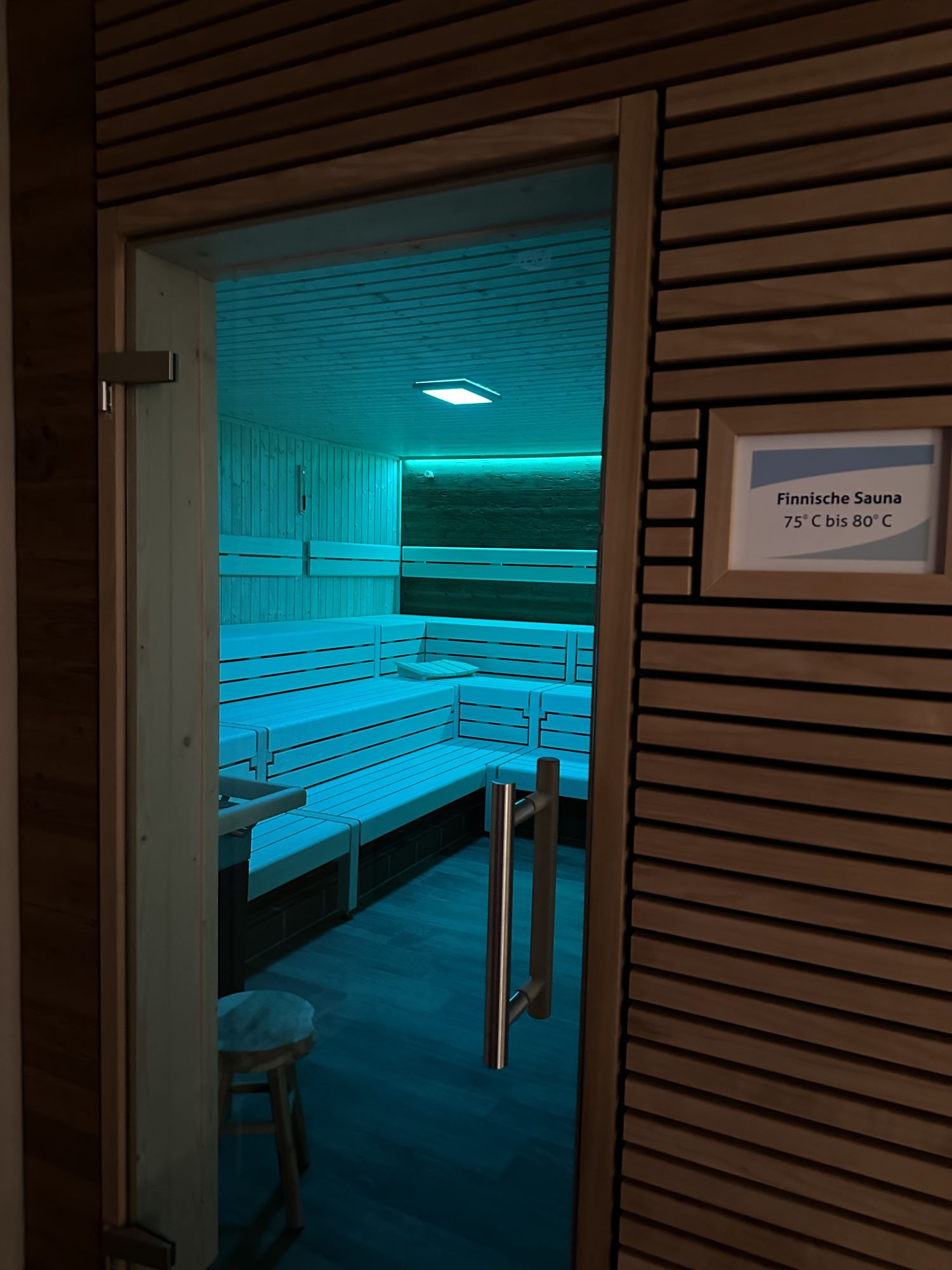 - drei unterschiedlich temperierte Saunen: Die Finnische Sauna (75 - 80° C für rund 30 Personen); Die Berg-Sauna (90° C für etwa 25 Personen); Die BIO-Sauna (milde 60° C bis 70° C für rund 30 Personen mit Duft-Aroma)