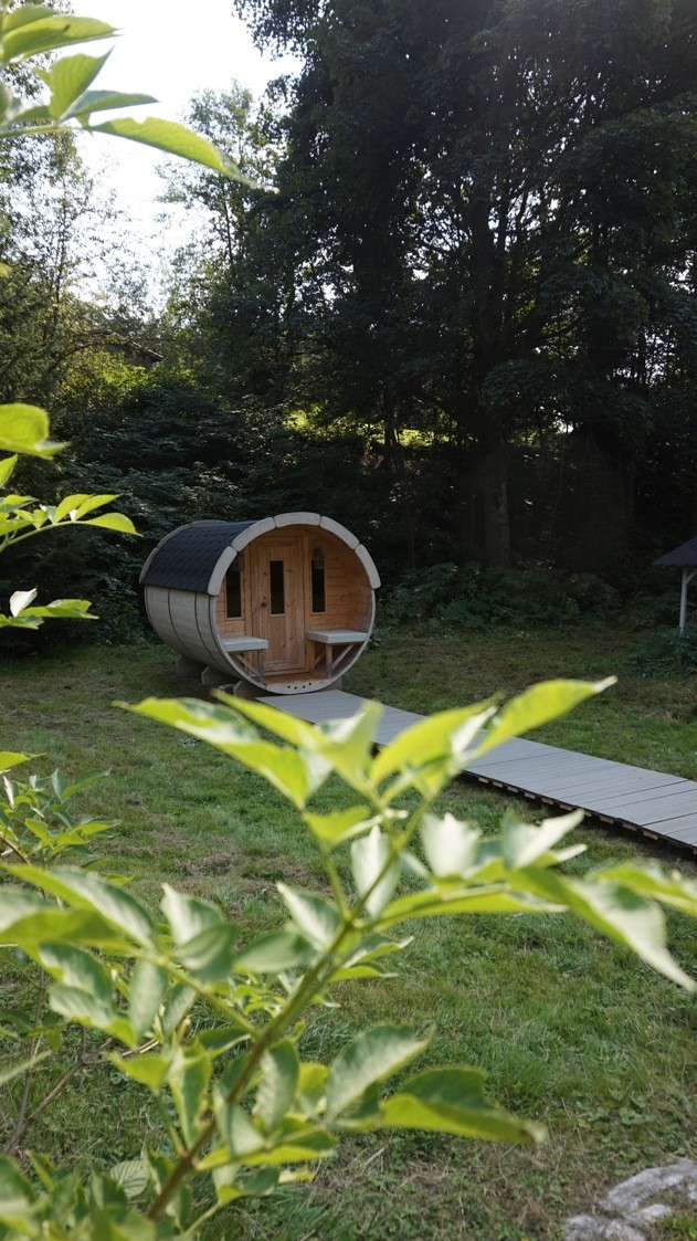 Fass-Sauna mit Panorama-Fenster (über Steg von Terrasse aus erreicbar)