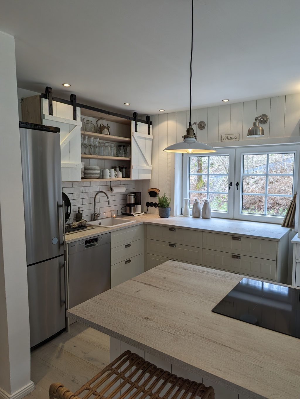 Voll ausgestattete Küche mit 4-Platten-Herd, Backofen, Kühlschrank, Geschirrspüler, Wasserkocher, Toaster und Equipment