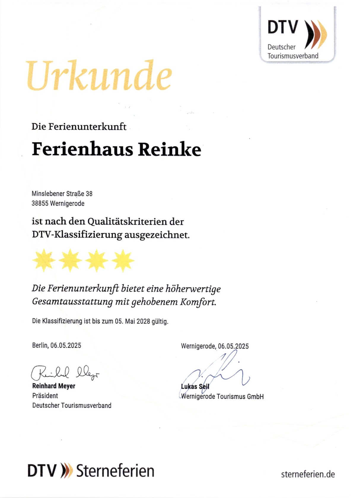 4-Sterne-Zertifizierung des Deutschen Tourismusverbandes: Die Ferienunterkunft bietet eine höherwertige Gesamtausstattung mit gehobenem Komfort.