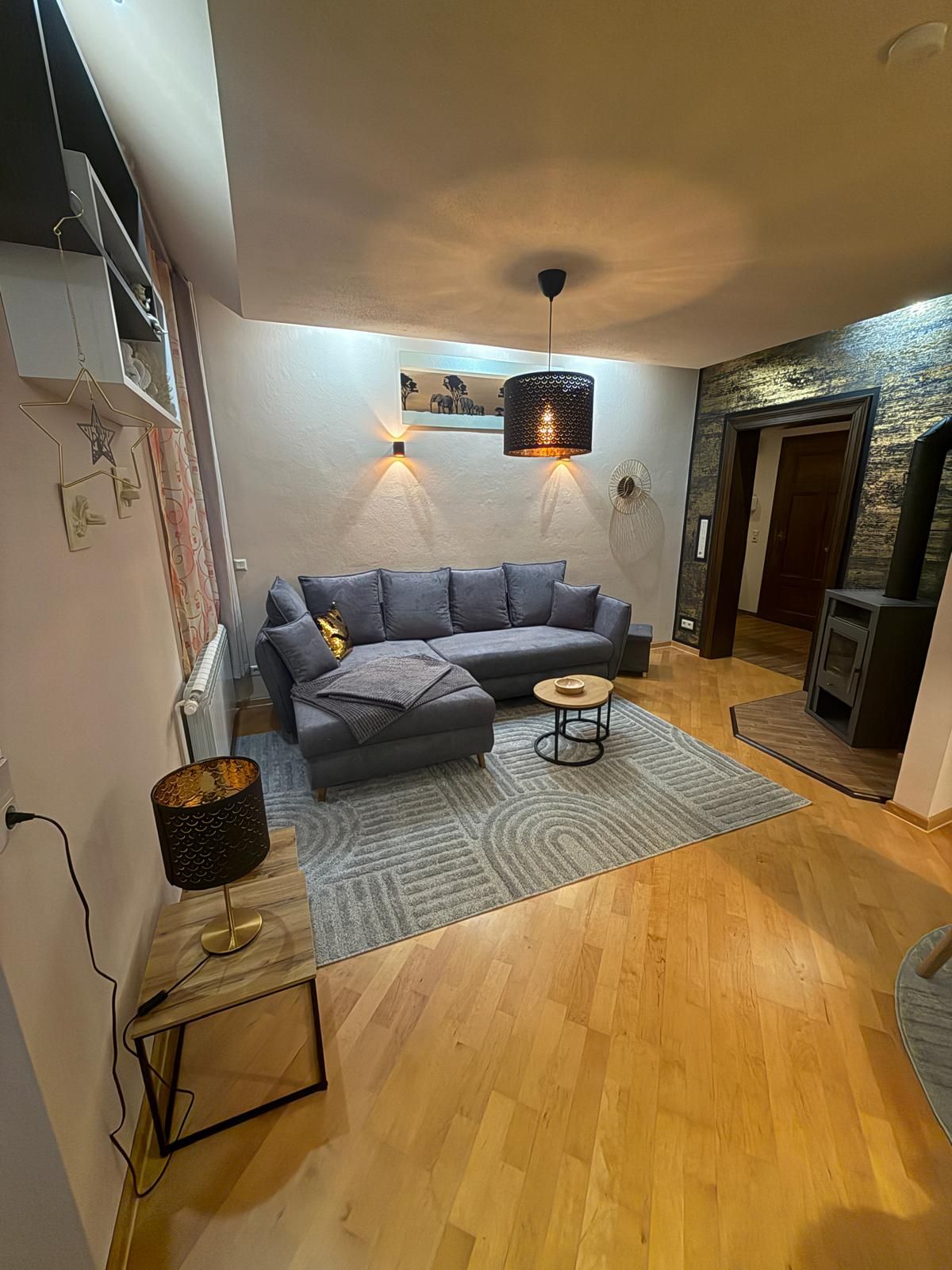 Wohnzimmer mit großzügiger Sitzecke, Flachbild-TV, Essbereich für 4 Personen, Kaminofen und separierter Erker mit Massage-Sessel