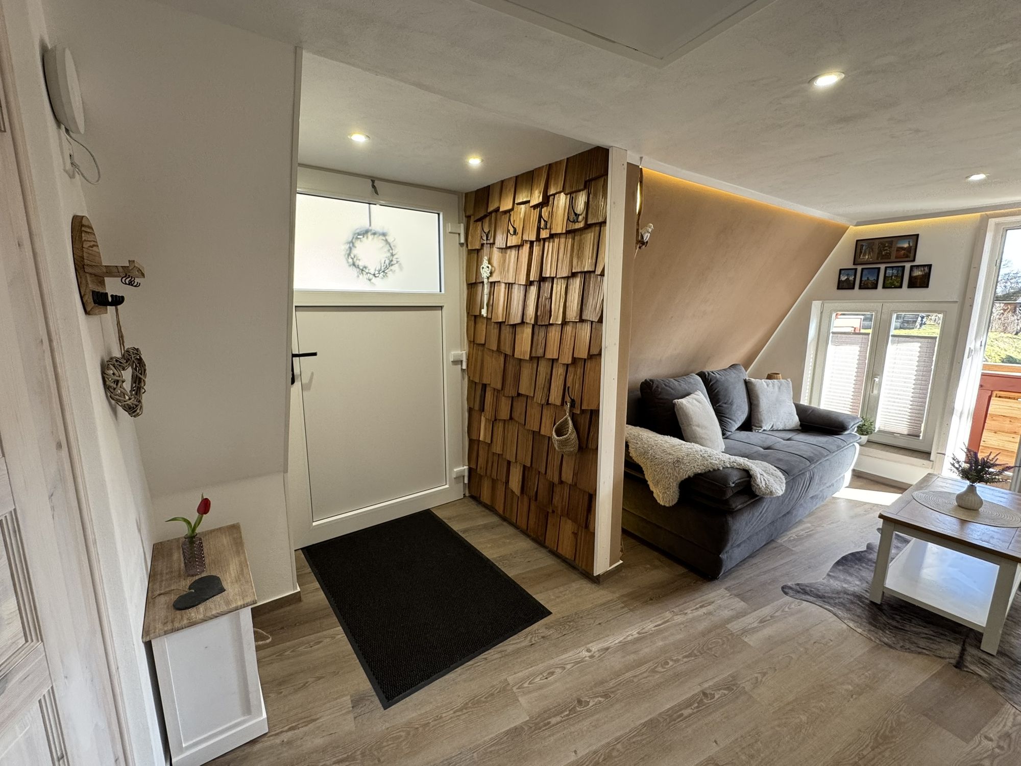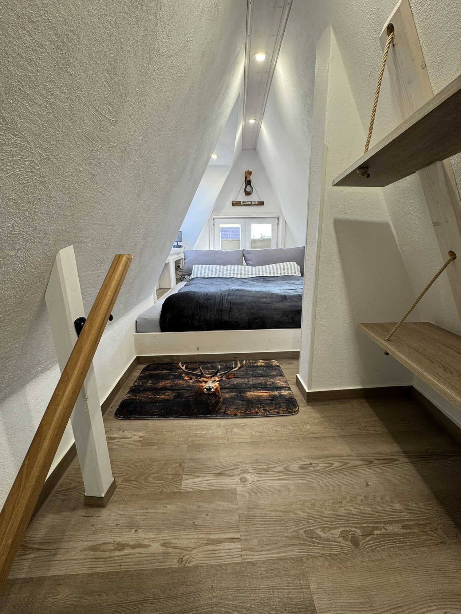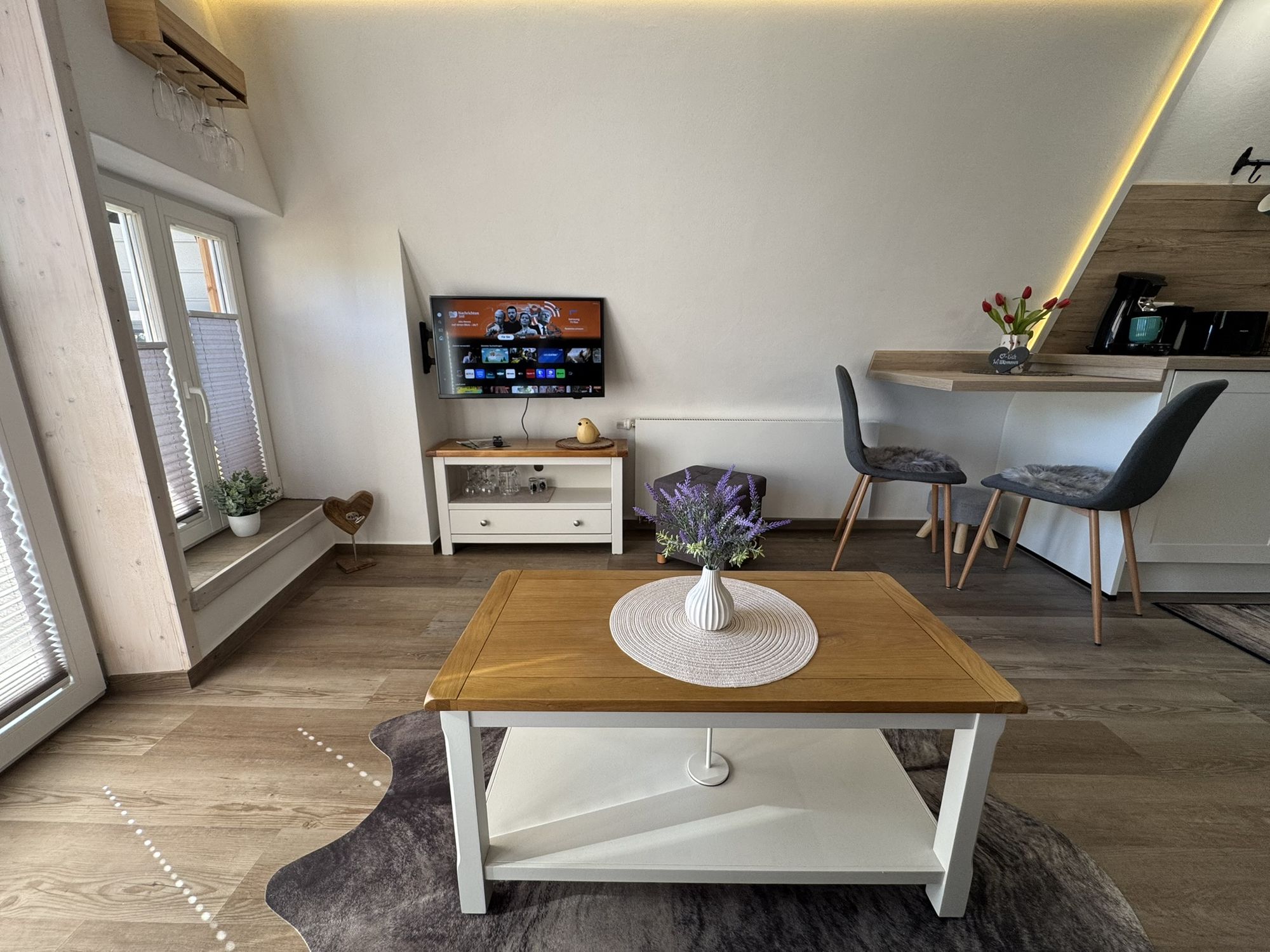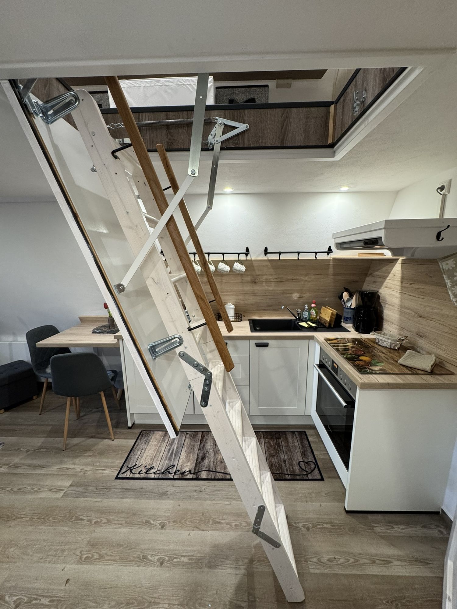 Freuen Sie sich auf den offenen Wohn- und Kochbereich, das moderne Bad und den kleinen, feinen Balkon. Ein ganz besonderes Highlight ist der Schlafbereich auf der oberen Ebene, der über eine Bodentreppe erreichbar ist (gute Mobilität erforderlich!). In klaren Nächten hat man das Gefühl, man liegt im Wald direkt unter den Sternen. Romantisch und einfach wunderbar!