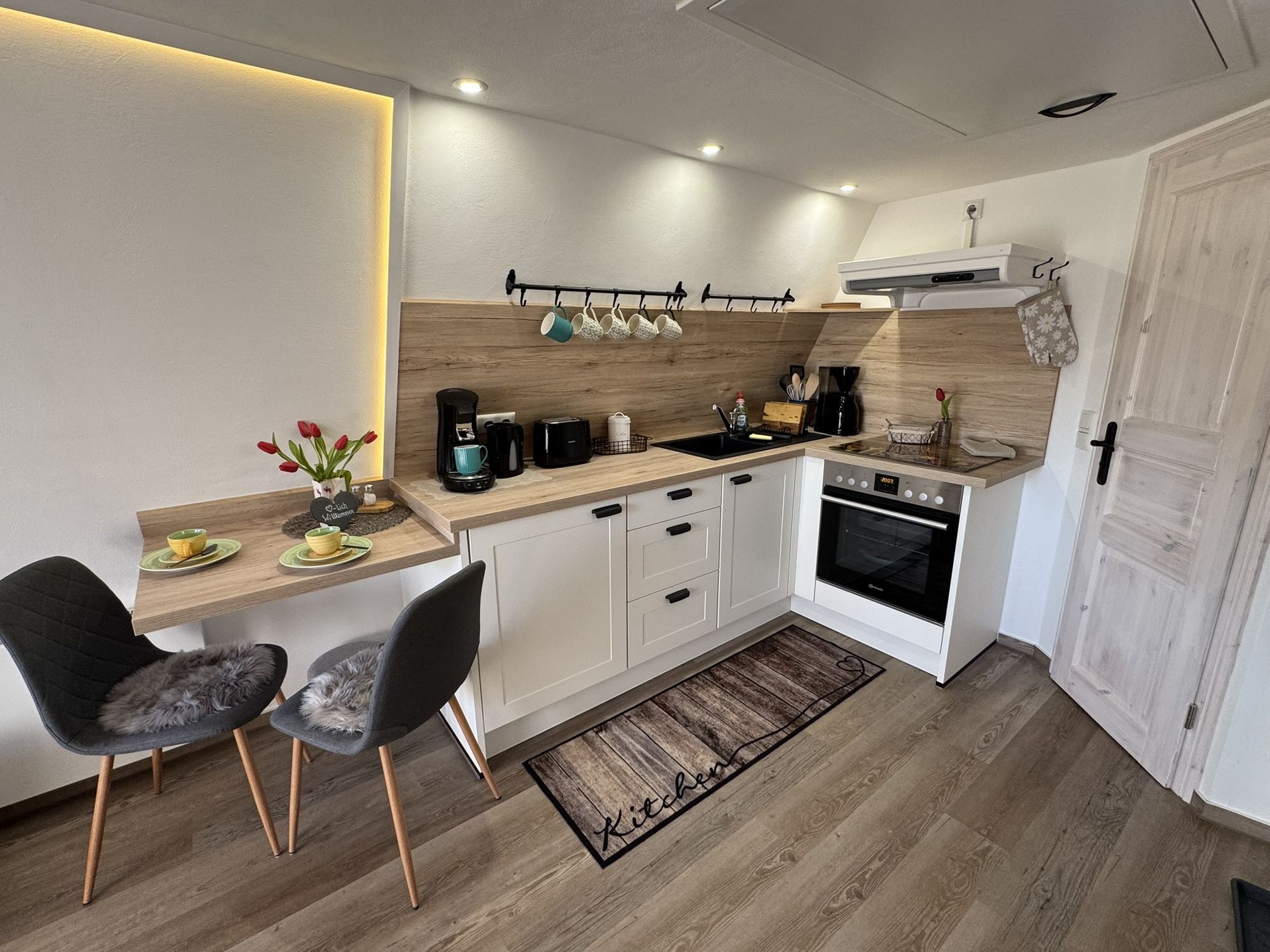 Voll ausgestattete Küche mit Backofen mit Induktionsfeld, Kühlschrank mit kleinem Gefrierfach, Kaffeemaschine, Pad-Maschine, Wasserkocher, Toaster, Spülbecken