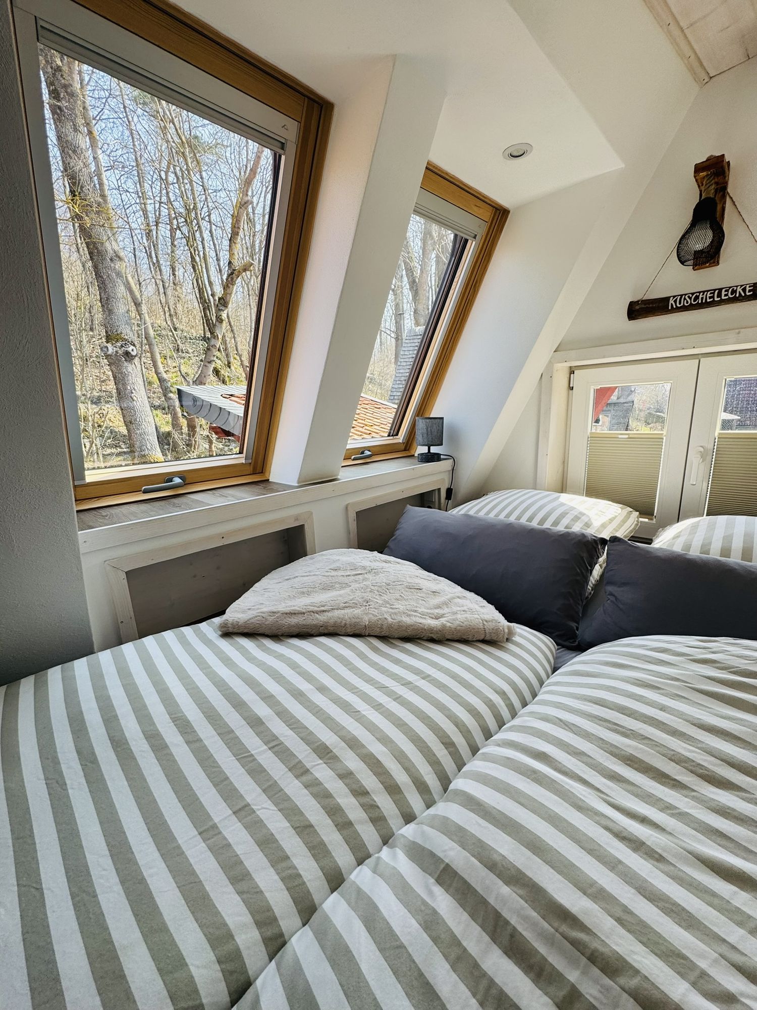 Schlafzimmer auf dem Schlafboden (über Bodentreppe erreichbar) mit Dachschräge (Deckenhöhe 1,40m) und maßgefertigten Matratzen (140cm x 200cm), Dachfenster zum Sterneschauen