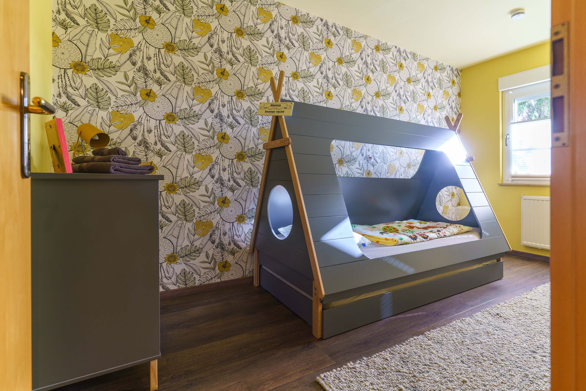 So ein Kinderzimmer wünscht sich jedes Kind: ein cooles Wigwam-Bett mit Ausziehfunktion für den kleinen Wirbelwind. Und wenn zwei Kinder hier wohnen, wird der Schlafplatz bestimmt jede Nacht getauscht – Abenteuer inklusive!